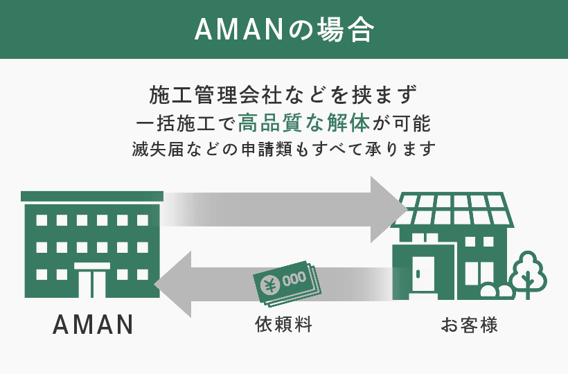 株式会社AMANは幅広い構造にも対応可能な解体業者です。解体工事は一つひとつの作業を丁寧かつスピーディーに行い、お客様にご満足いただける解体工事をお届けいたします。すべての作業を担うことで中間マージンなどは一切発生しないため、適正価格でのご提供が可能です。